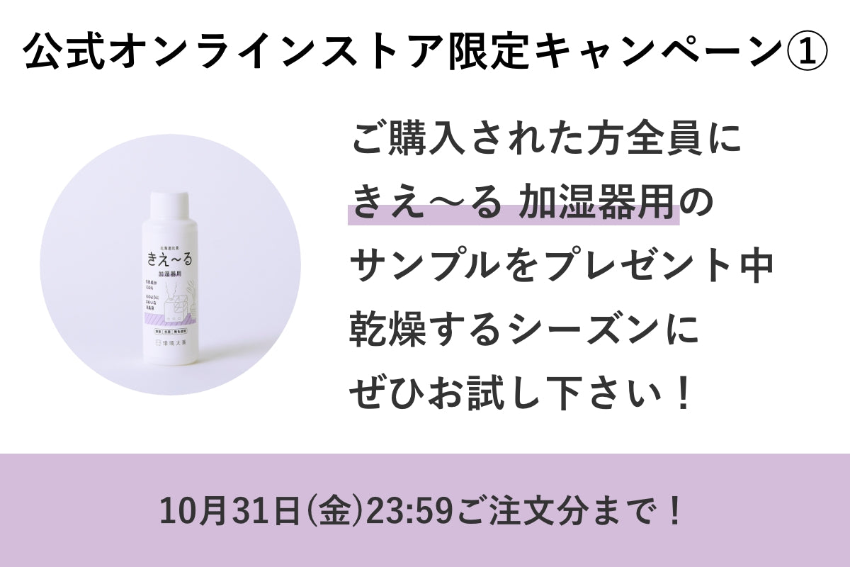 公式オンラインストアでご購入された方全員に「きえ〜る 加湿器用」の100mlサンプルをプレゼント!