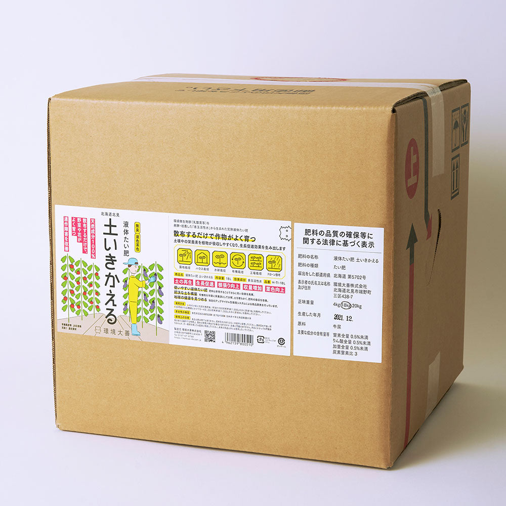 「液体たい肥 土いきかえる」は、土の中の微生物を活性化し、花や作物の育ちを助ける土壌改良液です。